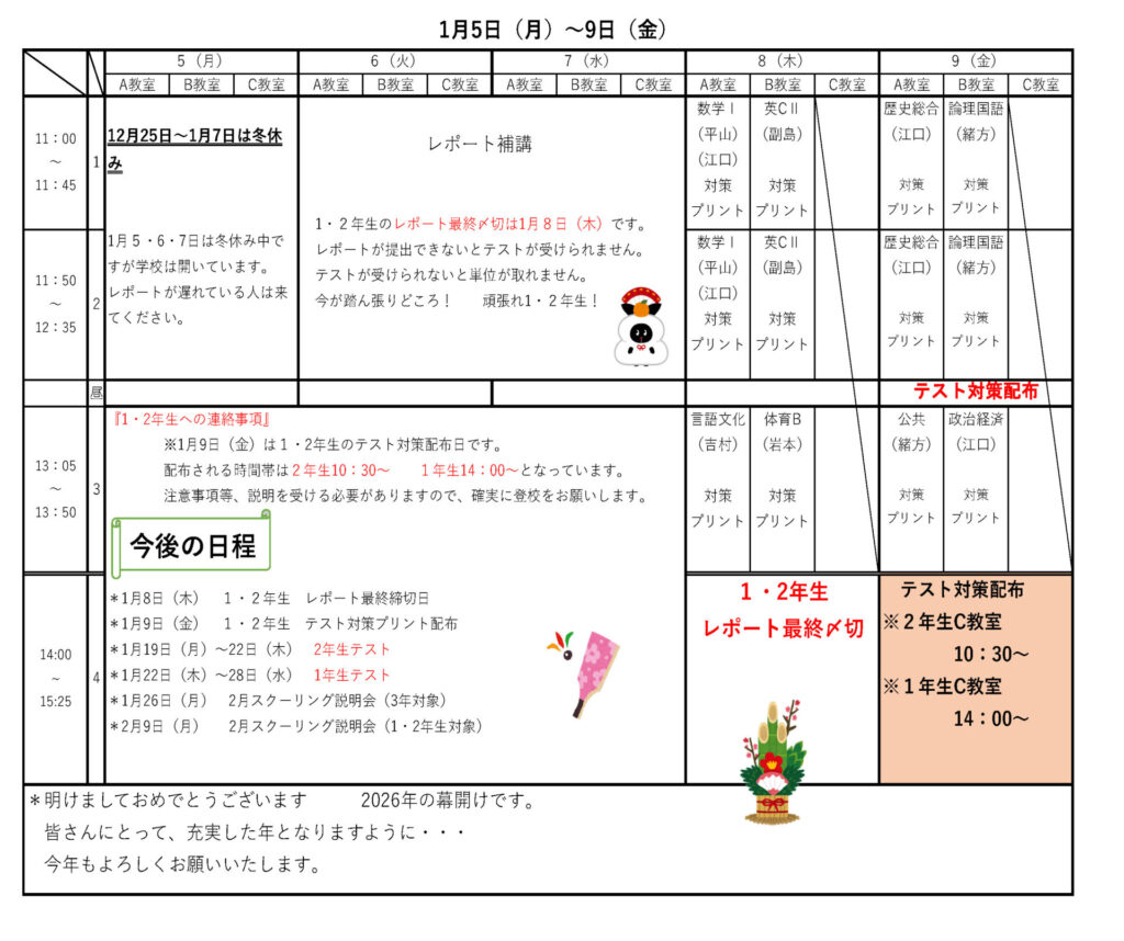 また、1月9日(金)は1・2年生のテスト配布日です。